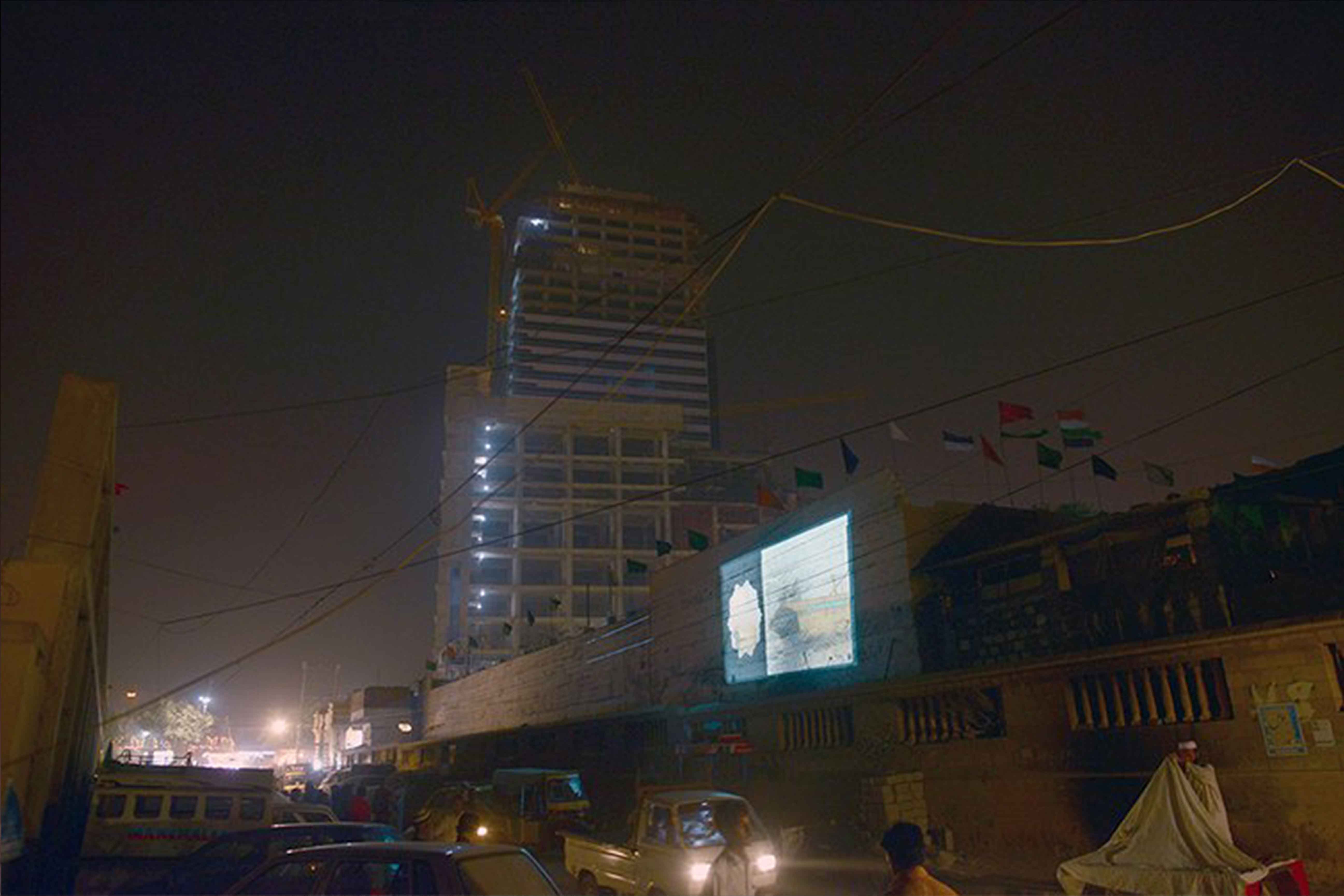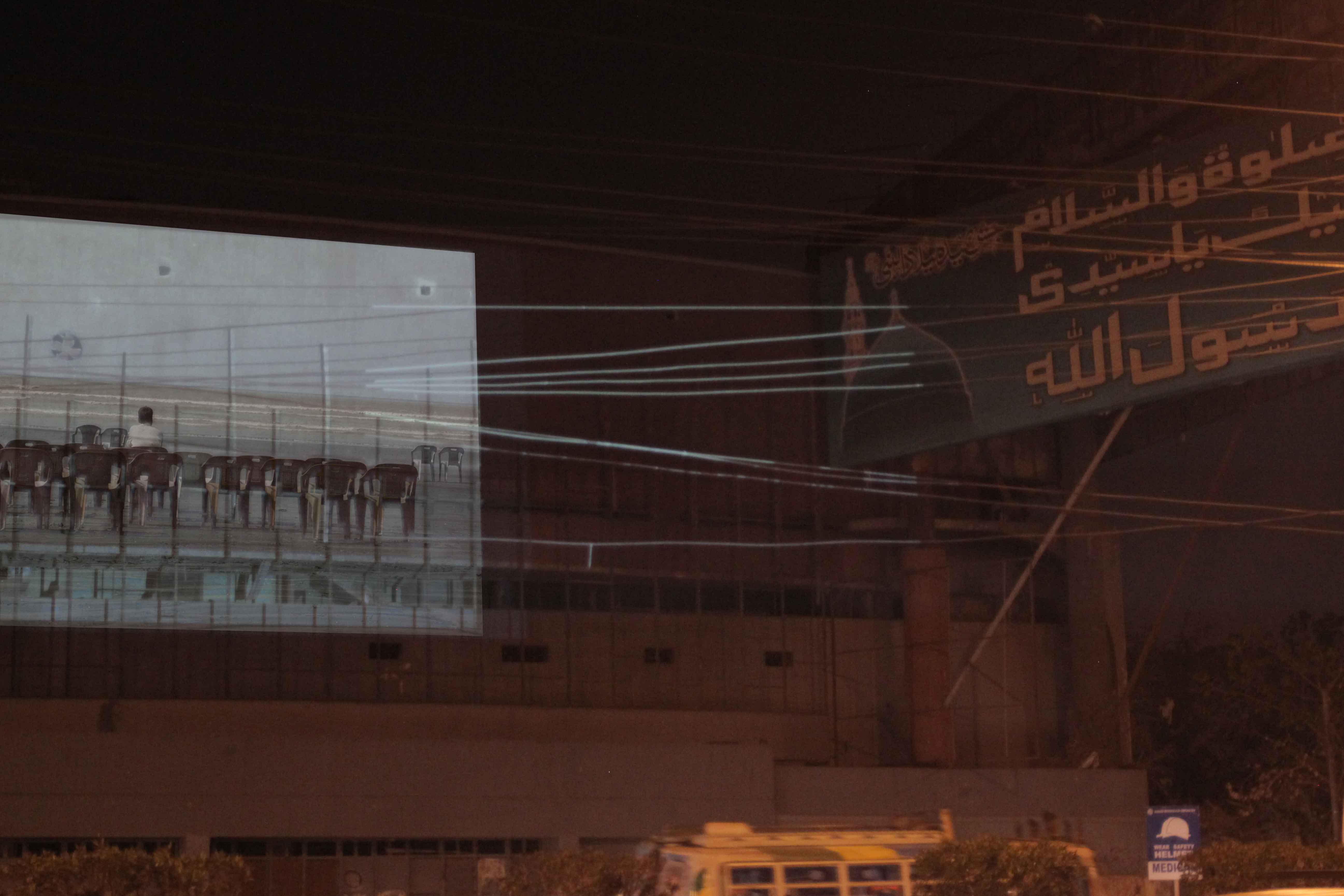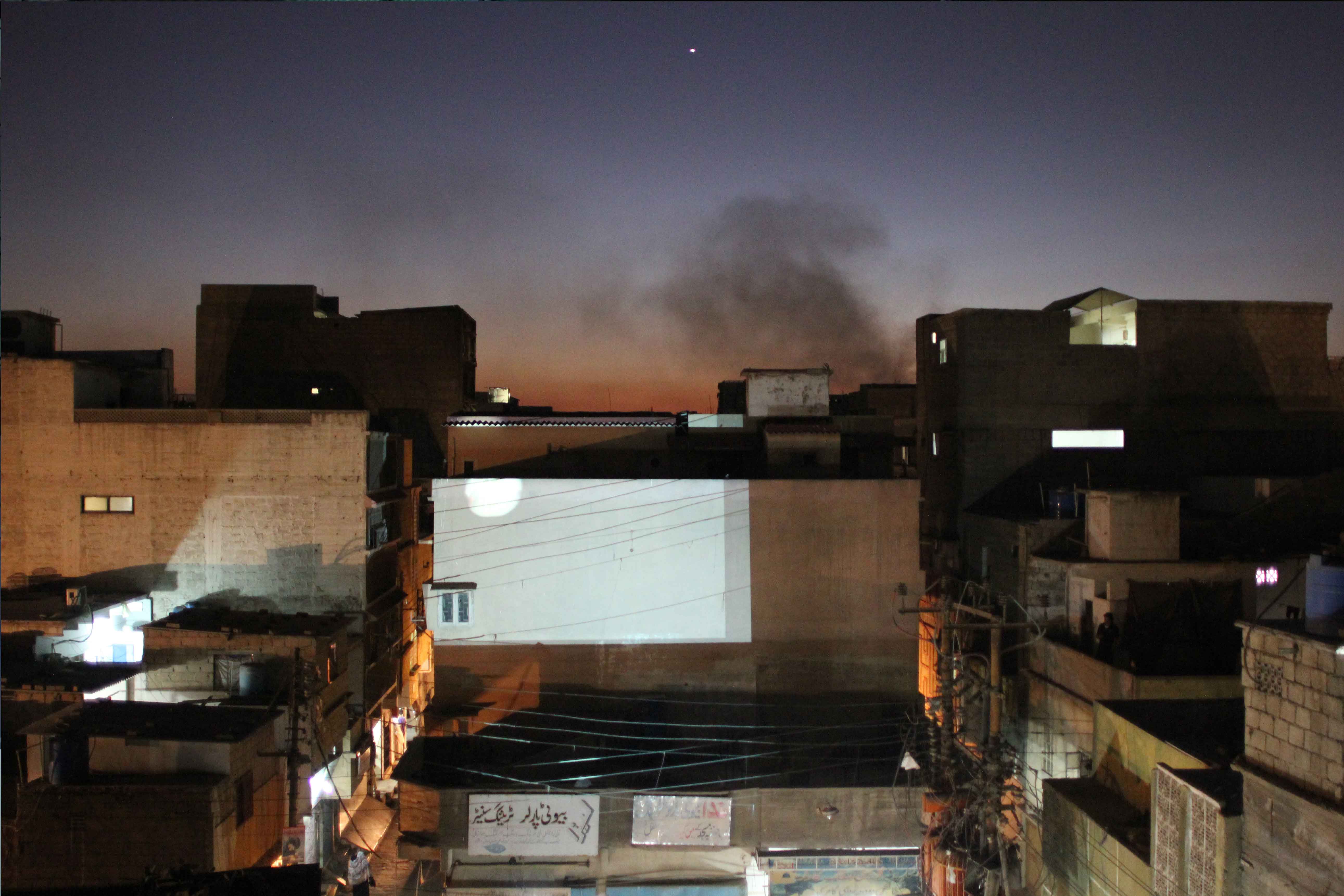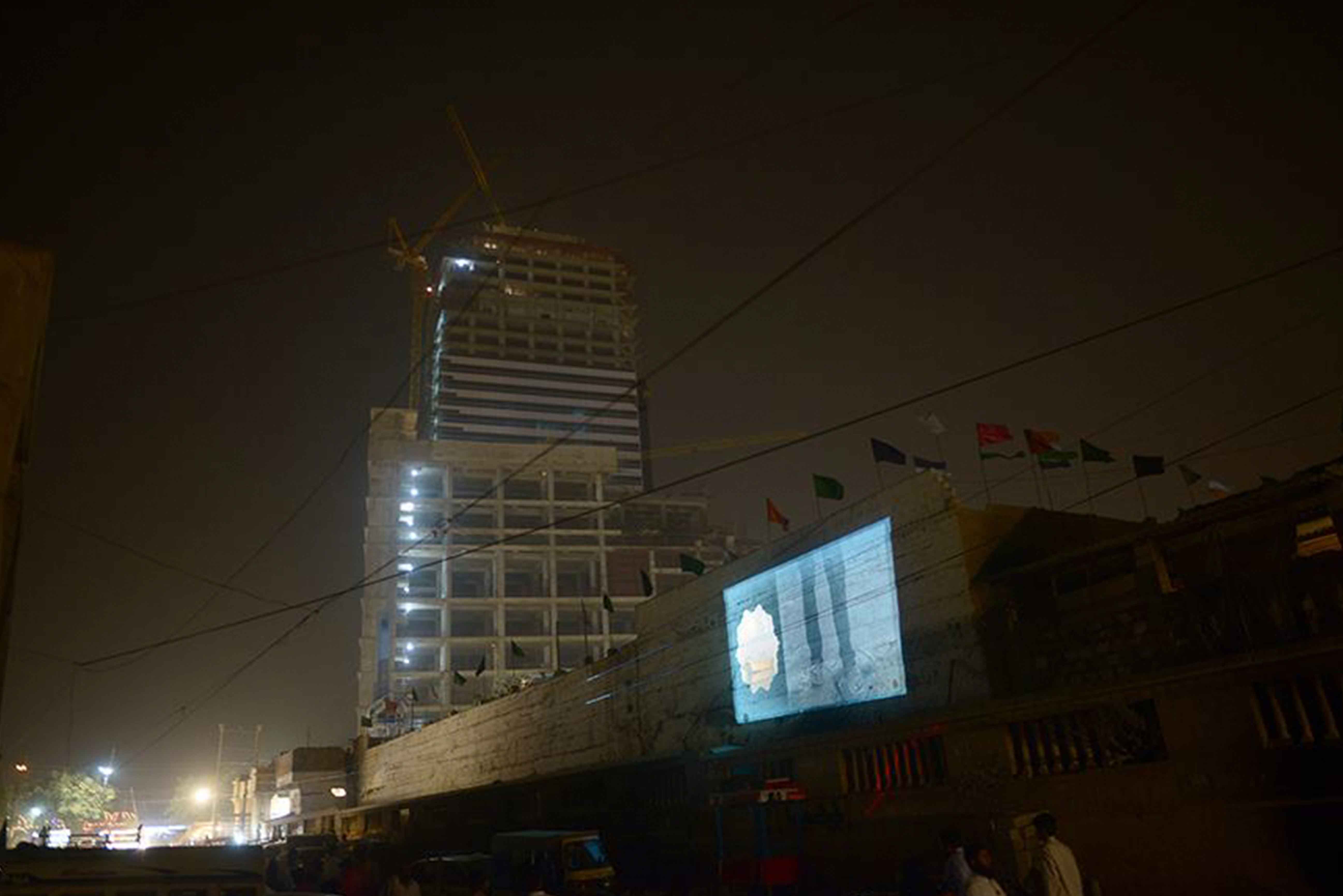 Projections is a series of collaborative experiments in the possibilities and limitations of public art practice in Karachi. Using luminous imagery, we created ephemeral events/moments in various public spaces – commercial markets, intimate residential areas, defunct cinemas, under construction development sites and spaces in transition – in an attempt to imagine and project ourselves, our histories and futures onto the city's surfaces.